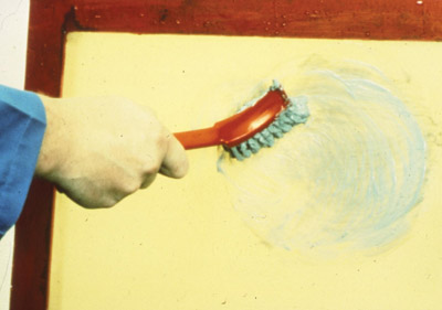 Abraders come in powder, paste and gel forms. Modern polyester mesh threads are extruded (similar to fishing line), and are slick and smooth so stencil films do not adhere readily. Abrading the mesh increases the surface area on the knuckles for better gripping by the stencil film. Abraders are fine silicon carbide micro-grit preparations. Surprisingly, despite their effectiveness, they don’t feel rough when rubbed between your fingers! This is because the particles are so fine.